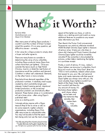 ¡@¡@§Ú±j¯P«ØÄ³¨C¤@¦ì Zippo ¦¬Âê̡A·í§A¬°§AªºÂë~¶i¦æ¦ô»ù©Î¦³¥X°âªº¥´ºâ®É¡A§A¤@©wn¹w¥ý§@ÂI¥\½Ò¡B¤F¸Ñ¤j¬ùªº¥«È¦æ±¡¡C¹³¤@¨Ç¦¬ÂêÌѼֳ¡ (¦p Zippo Click) ´N¬Oµ´¨Îªº¥«È¦æ±¡¸ê°T¨Ó·½¡A¦b³oùاA¥i¥H«Ü®e©öÀò±o¦UºØ¾P°â¸ê°T¨Ã¬Û¤¬¤ñ»ù¡A§A©Î³\µLªk±o¨ì³Ìºë½Tªº¦æ±¡¸ê®Æ¡A¦ý§A¥i¥H±N¦Û¤vªº¿W¯S¬Ýªk»P¥L¤H¬Û¤¬¥æ¬y¡AÂÇ¥H¤F¸ÑÂë~ªº°ò¥»¥«È¦bþÓ½d³ò¡A¦³þ¨Ç¦]¯À©Î¯S¦â¥i¥H¹ïÂë~¦æ±¡²£¥Í¼vÅT¡A¦P®É¤]¯à±o¨ì³Ì·sªº¥æ©ö¸ê°T¡C ¡@¡@±µ¤U¨Ó¡A¼vÅT¥«Èªº¦]¯À¤¤ÁÙ¦³¤@±i¤ýµP¡G¡u¸g¾ú¡v¡C¤@ªT¨ã¤£¤Z¸g¾úªº Zippo ¥´¤õ¾÷¡A§Y¨Ï¥¦¬O³Ì¥¤Zªº 200 «¬´Ú¦¡ (Áá»Ì©Ôµ·Ãú±)¡A¥¦¤]¯à¾Ö¦³·B¬üµ}¥@¬ÃÄ_ªº¶Æ¤H»ùÈ¡CÁ|Ó¨Ò¤l¡A³oªT Zippo ¥´¤õ¾÷´¿¸g¬°½Ö©Ò¾Ö¦³¡H¦pªG¥¦ªºìª«¥D¬OªkÄõ§J¡D¨¯¨º©} (Frank Sinatra)¡A¦Ó¥B§A¤]¯à¤@¨Öªþ±aÃÒ©ú¤å¥ó¡A¦p·Ó¤ù¡B´£¤Î¥´¤õ¾÷ªº¨p¤H®Ñ«H©ÎÁʶR¦¬¾Ú ¡K µ¥¡A³oªT Zippo ªº¥«È¦æ±¡¤@©w·|°ª¨ì¤@Ó¥O§AÃø¥H¸m«HªºÅå¤H»ù¦ì¡C ¡@¡@³Ì«á¡AYn§Ú¥H¤@¥y¸Ü¨Ó§@ÓÁ`µ²¡A§Ú·|»¡¡G¡u¤µ¤Ñªº Zippo¡A©ú¤Ñªº¬ÃÂáI¡v¤£n±N§Aªº²´¥ú¥u©ñ¦b¤@¨Çµ}¥@¬Ã«~ (¦p¶Ç»¡¤¤ªº 1933 ¦~§¹¬ü«~¬Û Zippo ¥´¤õ¾÷)¡A¤Ï¤§¡A§AÀ³¸Ó¥h¦¬ÂòŦX§A¥Í¬¡«~¦ì¡BÓ¤H³ß¦n¡B¹ï§A¨ã«¤j¬ö©À·N¸q¡B§AÄ@·N±N¥¦ªø¤[¦¬Âêº Zippo¡C§Ú³Ì¬Ã¶Qªº¤@ªT Zippo¡A¥¤ZµL©_¡B²@µL¶Æ¤H¤§³B¡A¦ý¤£½×¥ô¦ó¤H¡B¶}¥X¦h¤Ö»ù¿ú¡A§Ú³£¤£·|§â¥¦½æ±¼¡C³o¥´¤õ¾÷¬O¤@³¡¾ú¥v¡B§Ú¼Ö·N»P¤H¤À¨Éªº¾ú¥v¡A¨C¦¸ÂI¤õ¦P®É¤]¤Ä°_§Ú̪º¦^¾Ð¡FZippo ¥´¤õ¾÷ªº¯u¥¿»ùÈ´N¦b©ó¦¹¡C |