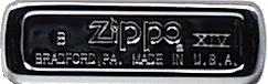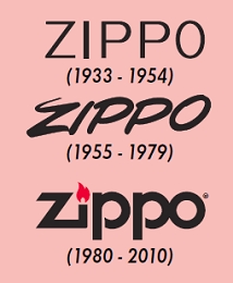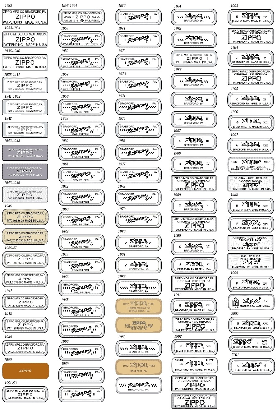 1933 - 1954 以正楷書寫 ZIPPO 1955 - 1979 使用斜體書寫 ZIPPO 1955 年起,所有 Zippo 打火機底部均刻上代表製造年份的識別碼 1980 年起,變更為火焰圖案 Zippo 商標。 1986 年起,在年份外另加入月份識別碼。 |