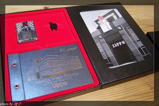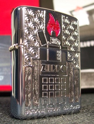 這一套紀念機原本是公司內部的耶誕禮品組,內容包含一枚採電腦雕刻加工的打火機與一張限量海報,打火機與海報構圖皆以總部大樓建築本身為主題;Zippo
