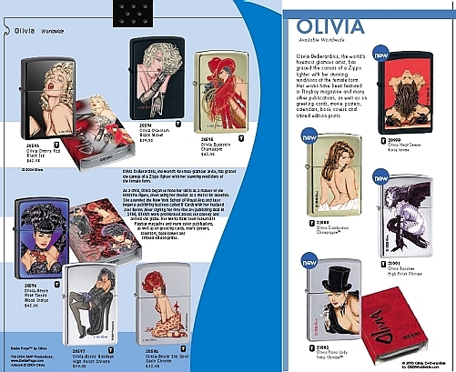 她是全球最具魅力的藝術家之一,她擅長以絕色艷麗的畫風來詮釋獨特的女性藝術創作;Olivia 的作品也為 Zippo 打火機增添收藏魅力。 自幼年開始,Olivia 便專攻女性人體繪畫來磨鍊自己的畫技,通常她都以自己的母親為描繪的範本。 她就讀於紐約大學視覺藝術系,之後她與丈夫 Joel Beren 成立一家出版社:O Cards。1984 年,Olivia 賣出第一件由她正式署名的作品,從此 Olivia 的事業開始向海外拓展並遍及全球;不只 Playboy 與其它書刊雜誌喜歡採用 Olivia 的畫作,她的作品也經常出現於各式卡片、電影海報、月曆、書籍封面與限量版出版品。 Zippo 公司於 2004 年發行六款 Olivia 作品主題機,2006 年再發行四款新作。 |