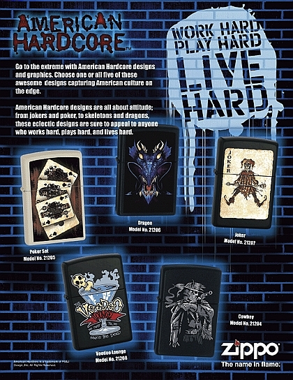 American Hardcore (美國核心意象),21204、21205、21206、21207 與 21208 共五款。 讓我們一起來欣賞美國核心意象 (American Hardcore) 的極端設計與偏激圖案。這五枚畫風詭異、令人生畏的新款 Zippo 打火機,皆以美國邊緣文化為基調設計而成。 美國核心意象 (American Hardcore) 的設計風格不但充滿叛逆,又非常強烈地向每個人訴求認真工作、認真娛樂與認真生活的美式人生理念。 |