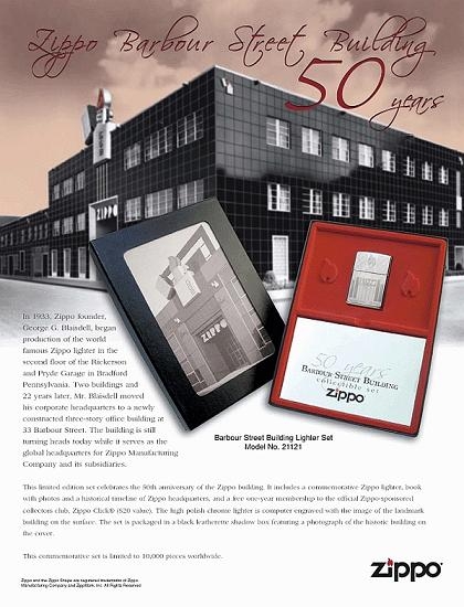 1933年,美國賓州布瑞福鎮 (Bradford, PA.),鎮上一家叫 Rickerson & Pryde 修車廠的二樓,Zippo 創辦人 – 喬治.布雷斯代 (George G. Blaisdell) 在此發明並開始生產舉世聞名的 Zippo 打火機。22 年後,Zippo 除已新建二座廠房建築外,喬治更將他的企業總部遷入位於巴柏雅大道 33 號 (33 Barbour Street),一座全新落成的三層樓建築內;直至今天為止,這座建築仍是 Zippo 與其子公司的全球企業總部大樓所在地。 這款限量版產品即是為了慶祝 Zippo 總部大樓落成 50 週年紀念。產品內容包含一枚紀念打火機,一本 Zippo 總部大樓的簡介小冊與價值美金 20 元的官方 Zippo Click Collectors Club 會員資格一年份。打火機底材為鏡面鍍鉻,以電腦雕刻方式將總部大樓圖案刻於打火機表面。這款產品的外包裝為外覆黑色人造皮的收藏盒,盒蓋正面為總部大樓特寫照片。 官方定價每套美金 42.95 元,全球限量 10,000 套。 |