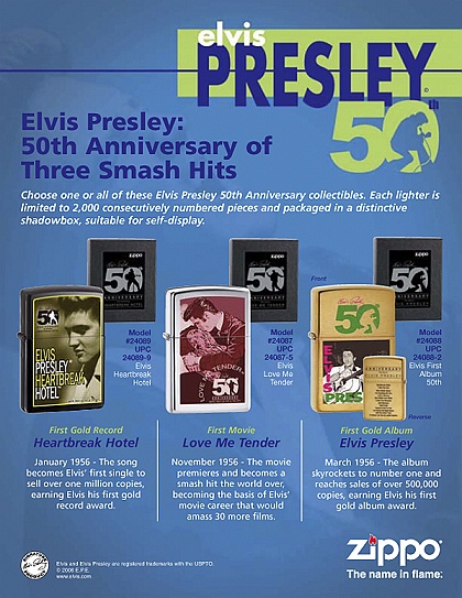 Zippo 公司本次發行三款 Elvis Presley 暢銷金曲五十週年珍藏版,供閣下任意挑選或全部蒐藏。每一款打火機皆限量發行 2,000 枚並於機身刻印限量編號,特別設計的精美包裝盒非常適合作為此套珍藏版展示之用,盒內也一併打印限量編號以茲辨認。 24089 - Elvis® Heartbreak Hotel (傷心旅社) - Elvis Presley 第一首黃金單曲 1956 年一月,此首單曲銷售突破百萬,為 Elvis 贏得第一張黃金單曲殊榮。 24087 - Elvis® Love Me Tender - Elvis Presley 第一首電影主題曲 1956 年 11 月,Elvis 主演的第一部電影「Love Me Tender」(鐵漢柔情),同名電影主題曲在 Elvis 的主唱下立即成為轟動全球的暢銷歌曲,自此 Elvis 跨足演藝事業,畢生參與之電影演出超過三十部。 24088 - Elvis® First Gold Album 50th - Elvis Presley 第一張黃金專輯 1956 年 3 月,這張「Elvis Presley」專輯一發行就立即以迅雷之勢攻佔排行榜榜首,銷售量很快地突破五十萬張也為 Elvis 贏得第一張黃金專輯。此枚打火機除正面彩印處理外,背面蝕刻有本張專輯之全部曲目。 |