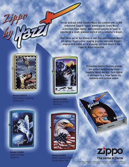 Mazzi 作品主題機,24079、24080、24081 與 24082 共四枚。 Claudio Mazzi 是一位意大利噴畫畫家,他以手工噴畫繪製的 Zippo 打火機已超過 11,000 枚且件件皆為藝術傑作。每一枚 Mazzi 手工繪製的 Zippo 打火機,都經過 Mazzi 縝密的構圖再輔以精湛、細膩的手工噴畫技法,在不擬草稿的情形下以噴槍直接在 Zippo 機身作畫,每一件 Mazzi 手繪 Zippo 都是令人嘆為觀止、珍貴的藝術創作,也是收藏迷心目中的夢幻收藏。 閣下千萬不可錯過這一次由 Mazzi 授權 Zippo 公司發行的主題打火機,Zippo 以先進的色彩影像處理技術,完整複製 Mazzi 的畫作並將畫作中的色彩與各項細節忠實呈現。 這一套 Mazzi 作品主題機,Zippo 公司分別採用四款不同的打火機底材來搭配大師的四款創作,相輔相成、彰顯特色;每枚主題機皆以錫盒包裝再配以特別印製之紙匣。 |