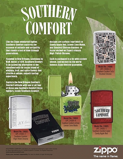 Southern Comfort 是美國甜酒的代表品牌,與 Zippo 防風打火機一樣,Southern Comfort 正確地掌握到品牌的本質並賦予商品變幻多樣的形象,使它能通過時間的考驗並穿越整個世代。 1874 年的美國路易斯安那州紐奧良市,M.W. Heron 在此創立 Southern Comfort;Southern Comfort 的引人之處在於她能勇於打破傳統,Heron 將水果與香料摻入未經精製的威士忌並以獨特秘方加以混合調製,調配出前所未有的全新酒類飲品,帶給消費者絕無僅有的舒暢口感。 Zippo 公司這次發行四款 Southern Comfort 品牌主題打火機,使閣下能藉由收藏這套 Zippo 打火機來一起掌握、分享 Southern Comfort 的品牌精神。Zippo 公司分別選用四款打火機底材並在機身各彩印四款 Southern Comfort 的企業識別標誌;四款底材為 Candy Apple Red (太妃糖蘋果紅)、Lemon Lime Matte (消光萊姆綠)、Brushed Chrome finishes (鍍鉻刷紋霧面) 與最經典、最耀眼的 High Polish Chrome (鍍鉻拋光鏡面)。 每枚打火機皆以錫盒包裝再搭配特別印製之紙匣,它們當然也擁有 Zippo 聞名全球的「終生免費保固」服務承諾。 |