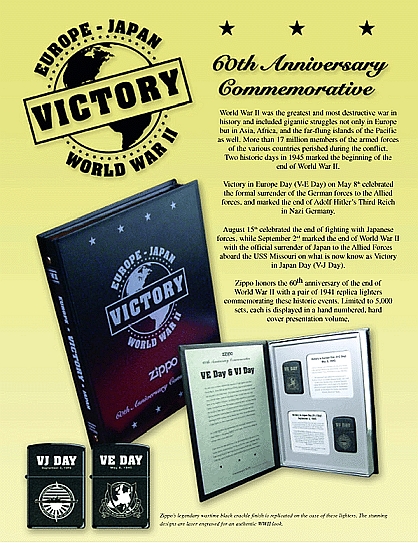 二次世界大戰是有史以來,規模最大、最具毀滅性的一場戰爭;除了歐洲捲入這場龐大的爭鬥外,連亞洲、非洲、甚至遙遠的太平洋群島也遭受波及、無法倖免。所有的參戰國為這場悲痛的衝突投入超過 1,700 萬名兵力;終於在 1945 年發生兩個具重大歷史意義的日子,二次世界大戰也因此正式結束。 1945 年 5 月 8 日為歐洲勝利紀念日 (Victory in Europe Day),當天德國正式向盟軍投降,同時也宣告由阿道夫.希特勒所建立的德意志帝國與納粹黨就此瓦解。 1945 年 8 月 15 日,日本終止所有的軍事行動,9 月 2 日,日本於美軍主力艦 – 密蘇里號簽署降書並向盟軍正式投降;這一天即為對日勝利紀念日 (Victory in Japan Day),至此,二次世界大戰正式結束。 2005 年 10 月 17 日,Zippo 公司非常榮幸能發行這套二戰終戰 60 週年紀念珍藏版,這套珍藏版包含二枚 1941 複刻版打火機,用以紀念這些意義深遠的歷史事件。這款產品全球限量 5,000 套,硬質封皮之書冊型收藏盒並於內頁以手工書寫限量編號。 |