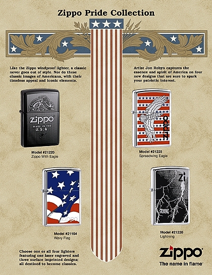Zippo 榮耀收藏版 (21164、21220、21225、21226) Zippo 防風打火機,永不褪流行的世界經典名作。它不只是美式經典圖像的代表,它更擁有著不隨時空改變的吸引力與變化無窮的圖案要素。 藝術家 Jon Robyn 這次所設計的圖案,正確地捕捉到美式風格的本質與精神,相信它能激勵 Zippo 消費者潛藏於內心的愛國情操。 |