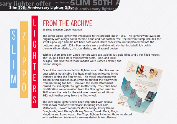 初期生產的 Slim 機型還有一項相當值得收藏的特殊設計,稱之為「Cobra Head」;即是在防風牆內側、火輪與棉蕊之間加入一片鐵片將火輪上緣與棉蕊隔開,在不影響火星噴發的情形下阻止火輪直接接觸火焰,以期防止火輪過熱。不過這項設計後來證實無效,1957 年,Zippo 公司取消了「Cobra Head」隔熱設計,同時將蕊孔與火輪的距離增加 1/32 英吋。 許許多多的知名品牌商標都曾出現於 Zippo Slim 打火機機身,如可口可樂、麥當勞、Howard Johnson’s Motor Lodge、Krispy Kreme Doughnuts、迪士尼的米老鼠、唐老鴨、Magic Kingdom and Epcot ... 等;眾多的知名品牌商標讓 Slim 款式打火機充滿蒐藏魅力並讓蒐藏家樂此不疲。 |