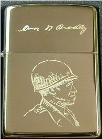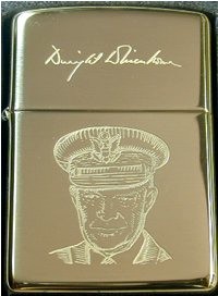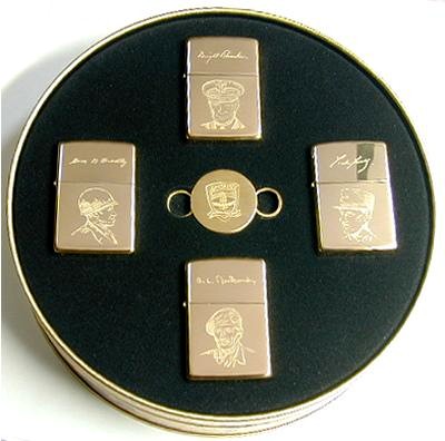 | 圓形鍚盒內包含四枚紀念打火機與一個鑰匙環,打火機正面分別刻上盟軍四位將領之肖像與簽名 | |
