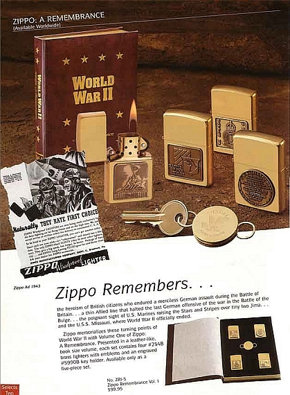 除了年度版之外,1995 年的重頭戲就是這套二戰終戰 50 週年紀念套裝版第一輯。 厚重的書冊型收藏盒內包含了四枚紀念打火機與一枚黃銅製紀念鑰匙環。打火機機身採黃銅材質,表面金屬貼章加工,四款打火機主題分別爲:不列顛空戰、突出部戰役、硫磺島血戰與美國密蘇里號戰艦。 官方發行定價美金 99.95 元,全球限量 25,000 套,是市場公認的收藏珍品。 |