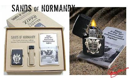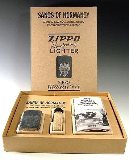 為了紀念諾曼第登陸 60 週年,Zippo 公司於 2004 年 4 月 18 日發行了 D - Day 60 週年紀念收藏版,全球限量 10,000 套。 外盒採二戰時期之復古樣式,打火機為 1941 複刻版,黑色裂紋烤漆機身,機身側面刻有限量編號。套裝內另附有一瓶內裝有真正採自法國諾曼第奧馬哈海灘的沙土與一本 8 頁簡冊。 |